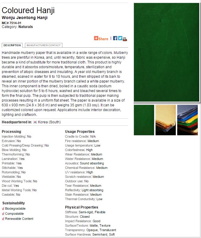 NYSID subscribes to the Material Connexion Digital Library, an online, searchable database of new, innovative, and sustainable materials. The database contains information on each materials' properties, life cycle, processing and more. Below is a sample material profile. Access to the database is free from library computers, and creating a personal account via the button in the top right corner of their website will allow you access from any computer. Visits can also be made to Material Connexion here in NYC to view their library materials in person.